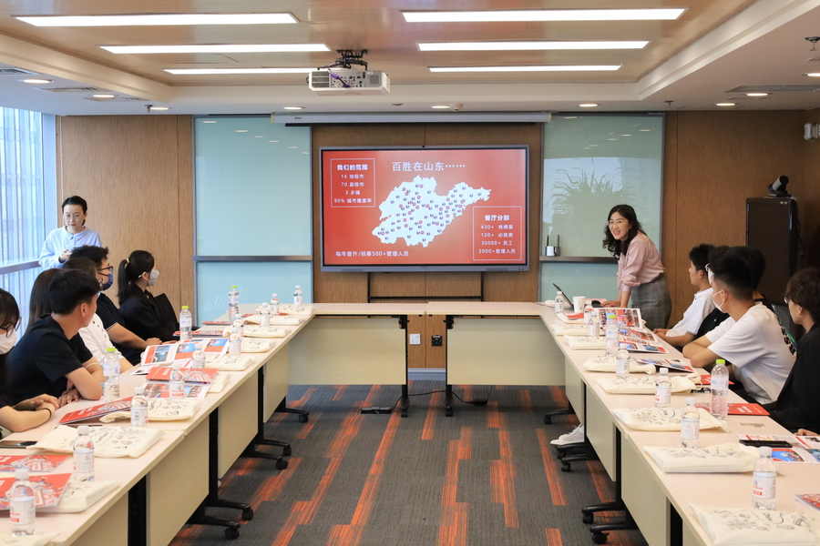 太阳成集团122ccvip师生走进青岛敦煌网科技有限公司、山东百胜连锁餐饮有限公司、青岛融商华海国际物流有限公司3家合作企业。走进青岛敦煌网科技有限公司,同学们了解到了该企业的发展定位、岗位设置、员工培养等,深入学习了跨境电商平台的实操知识;走进山东百胜餐饮有限公司,同学们了解到该企业的企业文化与发展布局,现场体验了门店促销、财务结算、单品管理、客户服务实践操作;走进青岛融商华海国际物流有限公司,公司董事长朱志强亲自讲解,结合公司的发展历程分享了一堂精彩的职业生涯规划课。在交流过程中,校企双方就员工就业、专业建设、人才培养、老员工创业等方面进行了深入探讨。