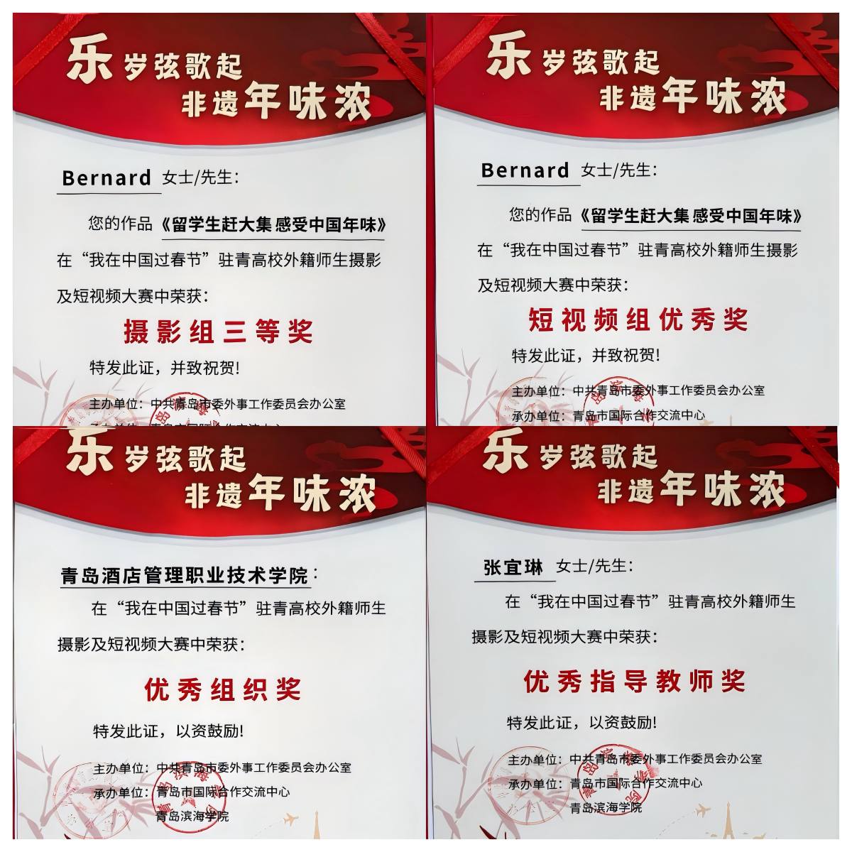 近日,公司在驻青高校外籍师生摄影及短视频大赛中喜获佳绩,参赛作品《职工赶大集 感受中国年味》分获摄影组三等奖和短视频组优秀奖,公司荣获“优秀组织奖”,张宜琳老师荣获“优秀指导教师奖”。