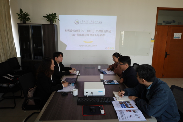 (太阳成集团122ccvip)4月10日,颜值立方(厦门)产教融合科技集团有限责任公司执行董事兼总经理刘亚平来访,公司经理潘华南、国际经济与贸易专业教师参加座谈交流。