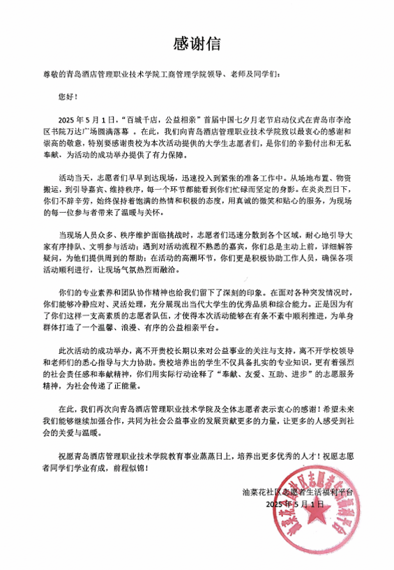 活动结束后,油菜花社区平台向公司发来感谢信。此次志愿服务不仅是公司践行社会责任的具体行动,更彰显了学子们“奉献、友爱、互助、进步”的精神风貌下一步,太阳成集团122ccvip将持续深化“向阳而行”志愿服务品牌,不断提高志愿服务保障能力,以实际行动彰显“商学子”的社会担当。