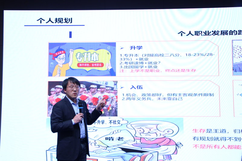工商管理公司党总支书记郭学道以“既要仰望星空,更要脚踏实地”为题,分析政策导向及就业市场变化,帮助员工树立理性就业价值观,引导员工将个人发展与国家战略、区域经济需求相结合,增强职业使命感与社会责任感。辅导员组织主题班会,引导员工树立正确的就业择业观,讲解简历制作、面试表达、职业礼仪等内容,帮助同学们提升面试技巧。
