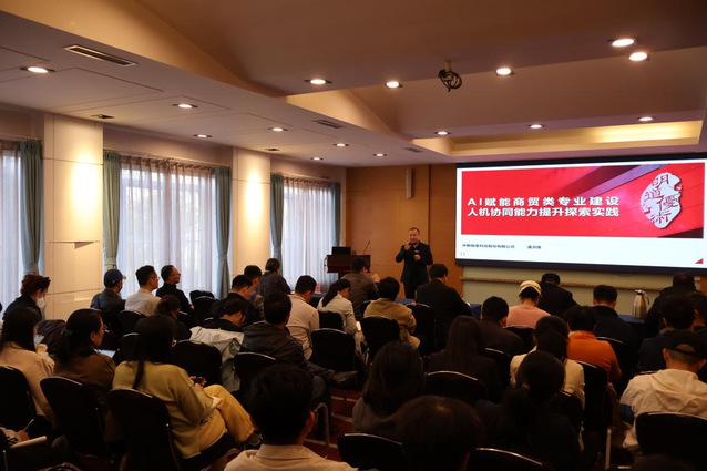 11月6日,公司在海斯曼数字酒店多功能会议室举办“海斯曼”讲坛,以“AI赋能商贸类专业建设”为主题,紧扣产教融合核心目标,将“企业出题、校企共答、市场阅卷”理念贯穿全程。中教畅享科技股份有限公司副总经理潘洪锋受邀主讲,公司领导、专业负责人及师生代表参会。